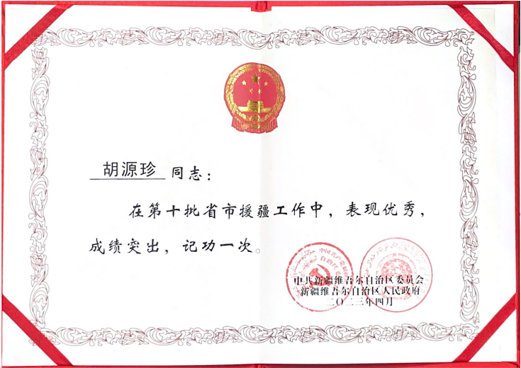 近日,公司304永利集团登录入口胡源珍教师被中共新疆维吾尔自治区委员会、新疆维吾尔自治区人民政府评为“第十批省市优秀援疆干部人才”,因在援疆工作中表现优秀、成绩突出,记功一次。