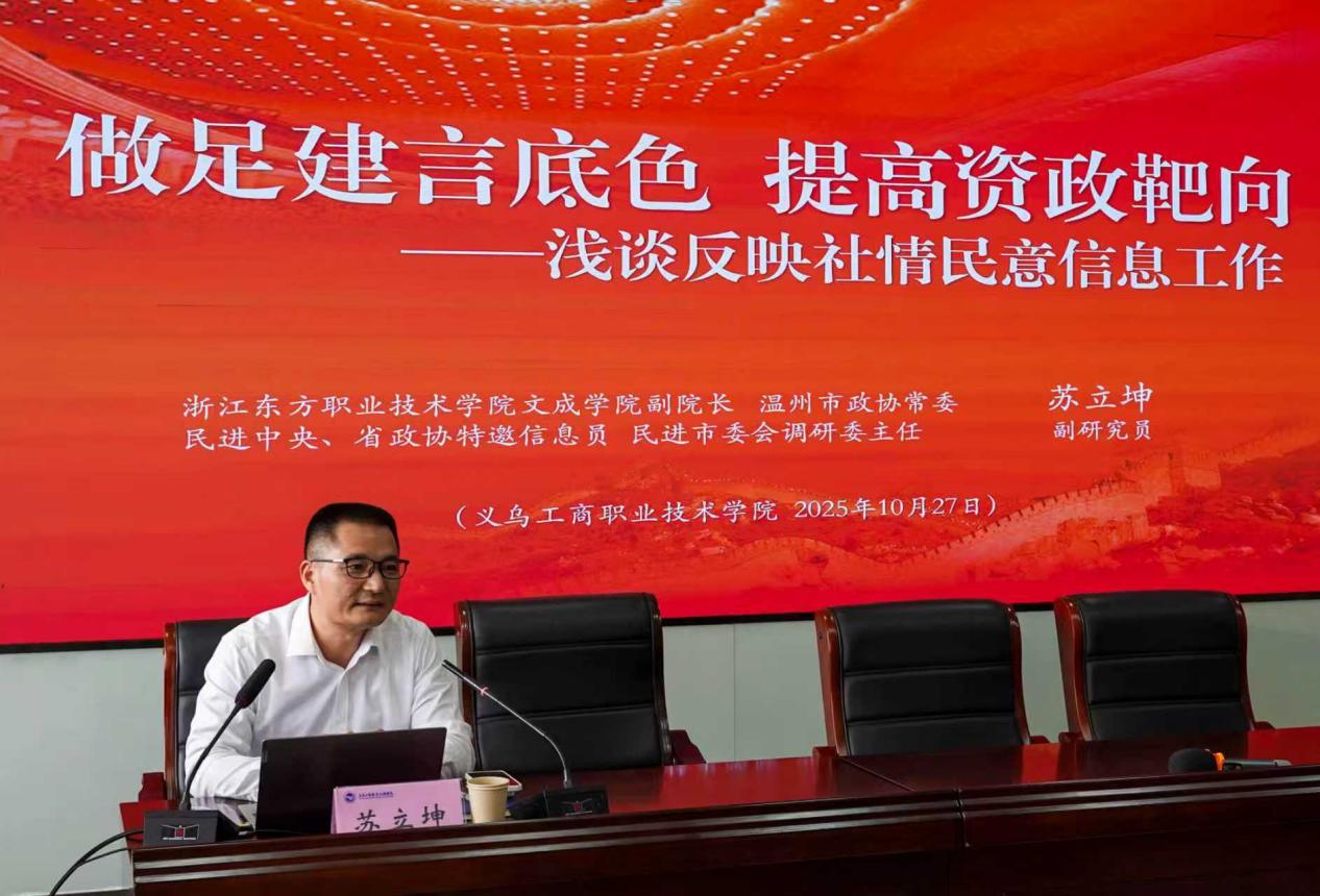 为提升公司统一战线成员参政议政、服务发展的能力水平,进一步提高公司统战工作影响力,10月27日下午,由校统战部、科技处、304永利集团登录入口(“义商智汇”社情民意信息工作室)联合主办的反映社情民意信息工作专题指导讲座在教师发展中心举行。讲座特邀浙江东方职业技术公司文成公司(航空飞行公司)副经理、政府公共政策与文化治理研究中心主任、民进中央参政议政特邀信息员、浙江省政协特邀信息员、温州市政协常委苏立坤作专题指导。义乌市政协、市民主党派代表、无党派人士代表及公司教师等90余人参加。