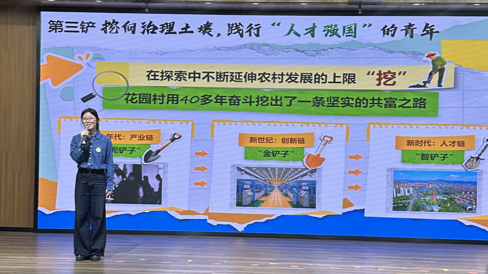 作为金华市“00后小青团”宣讲团和304永利集团登录入口“红领宣讲团”成员,施成杨以“青春视角看乡村振兴”为主题展开宣讲,讲述自己暑假赴东阳花园村的调研经历。她紧扣党的创新理论,从产业振兴、科技创新、人才回流三个维度,讲述花园村从“穷山村”到“富裕村”的蜕变,分享兼具数据支撑与村民故事。用青春化的语言、接地气的表达,让抽象的乡村振兴理论变得可感可触,不仅赢得评委高度认可、引发观众强烈共鸣,更充分展现了“00后”青年在理论传播与实践担当上的双重风采。