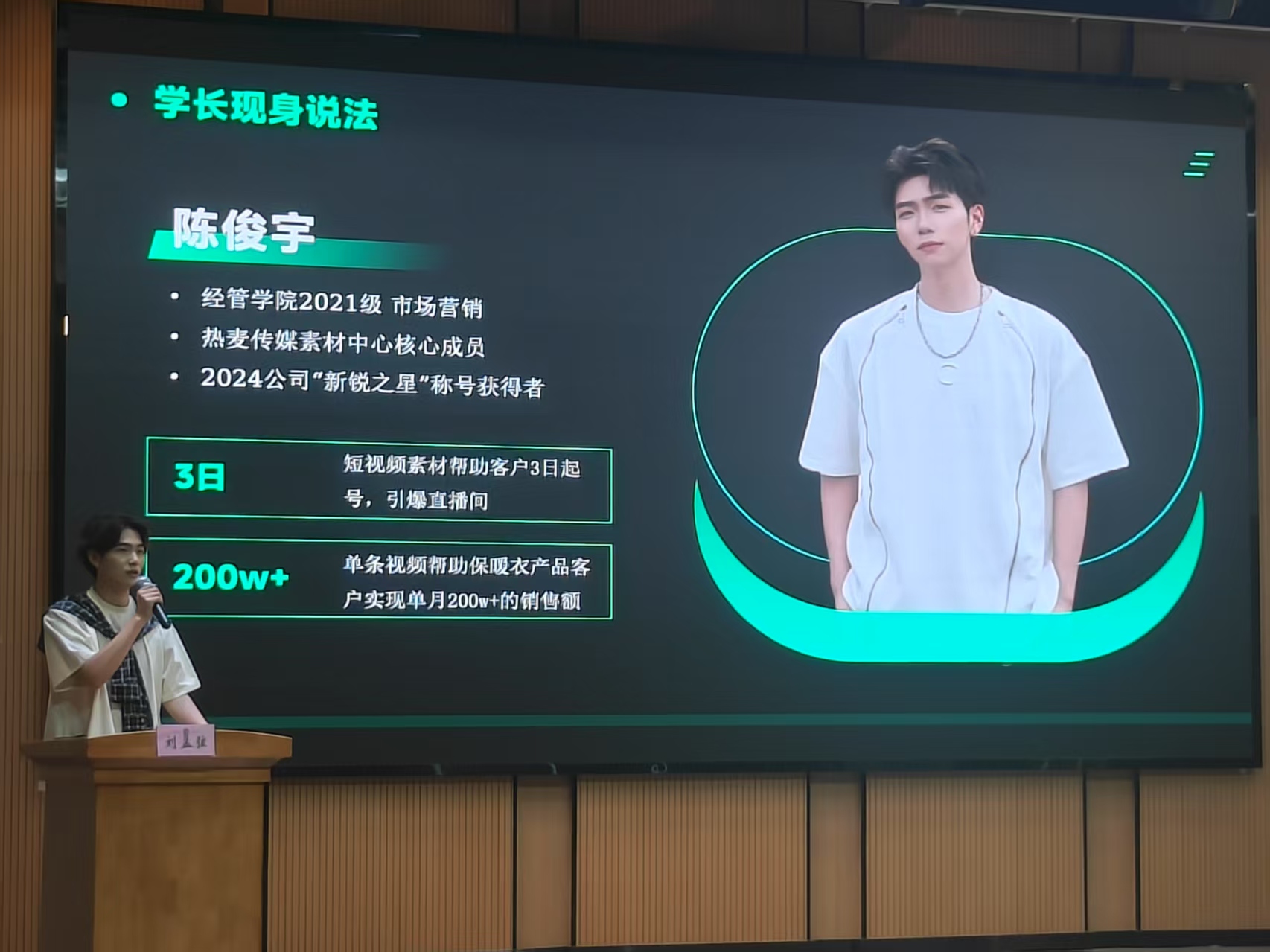 训练营开设“学长说”环节,热麦传媒核心团队成员、21级市场营销专业员工陈俊宇学长现身分享“三天起号、七日破万粉”的运营策略。“项目实战让我真正理解‘内容为王’的含义,数据思维才是新营销的核心竞争力。”陈俊宇在分享中强调。