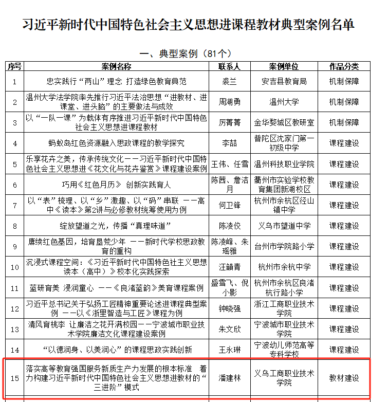 近日,浙江省教育厅办公室公布“习近平新时代中国特色社会主义思想进课程教材典型案例”名单,确定典型案例81个、培育案例128个,其中高职院校入选典型案例13个,公司潘建林教授《落实高等教育强国服务新质生产力发展的根本标准 着力构建习近平新时代中国特色社会主义思想进教材的“三进阶”模式》案例成功入选典型案例。