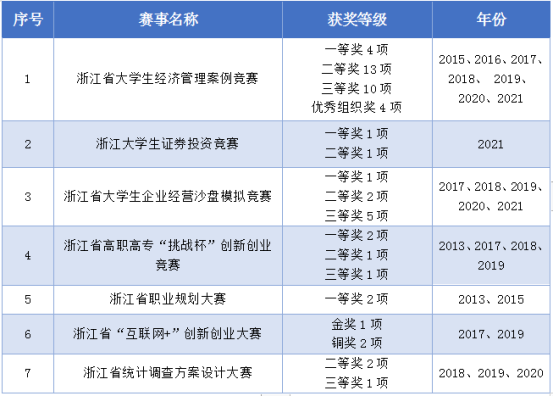 工商企业管理专业员工在校期间可参加各类竞赛,不仅能促进理论知识的学习和掌握,而且更加强化了理论与实际结合的实践能力,提高自身的创新和创意能力、整合知识的学习能力、指导实践的应用能力、复杂问题的解决能力等。专业员工获得省级大赛奖项如下表所示: